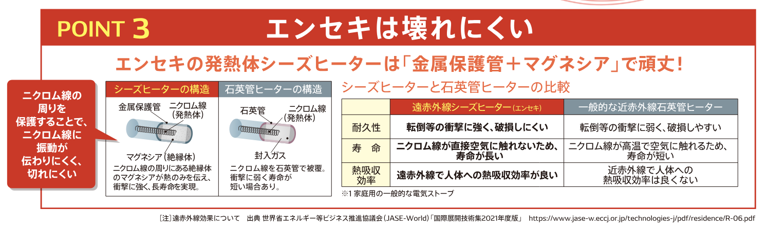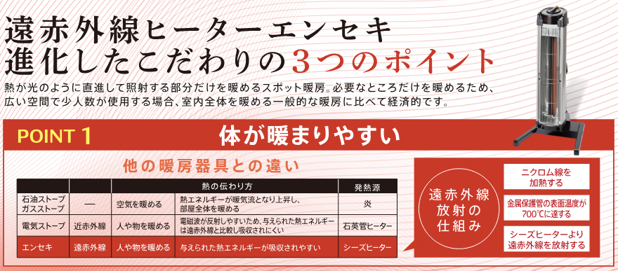 一方、エンセキは必要な場所だけをピンポイントで暖めるので、無駄がありません。