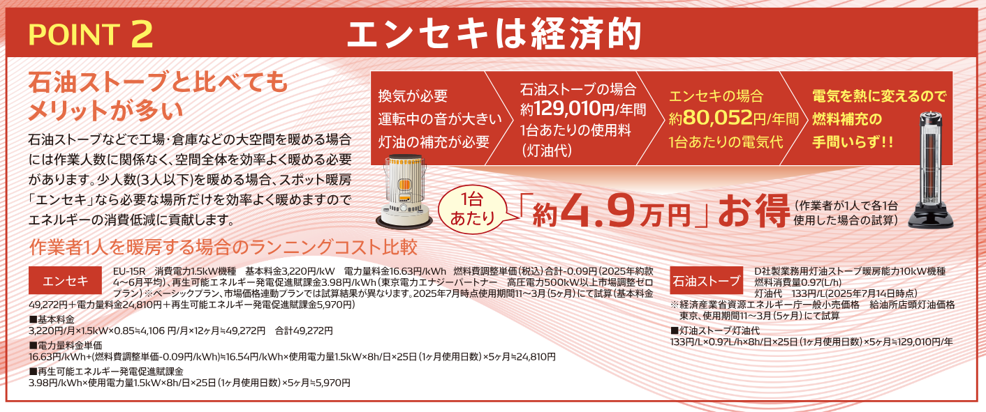さらに、少人数の作業環境では、石油ストーブに比べて年間約49,000円のコスト削減が可能です。