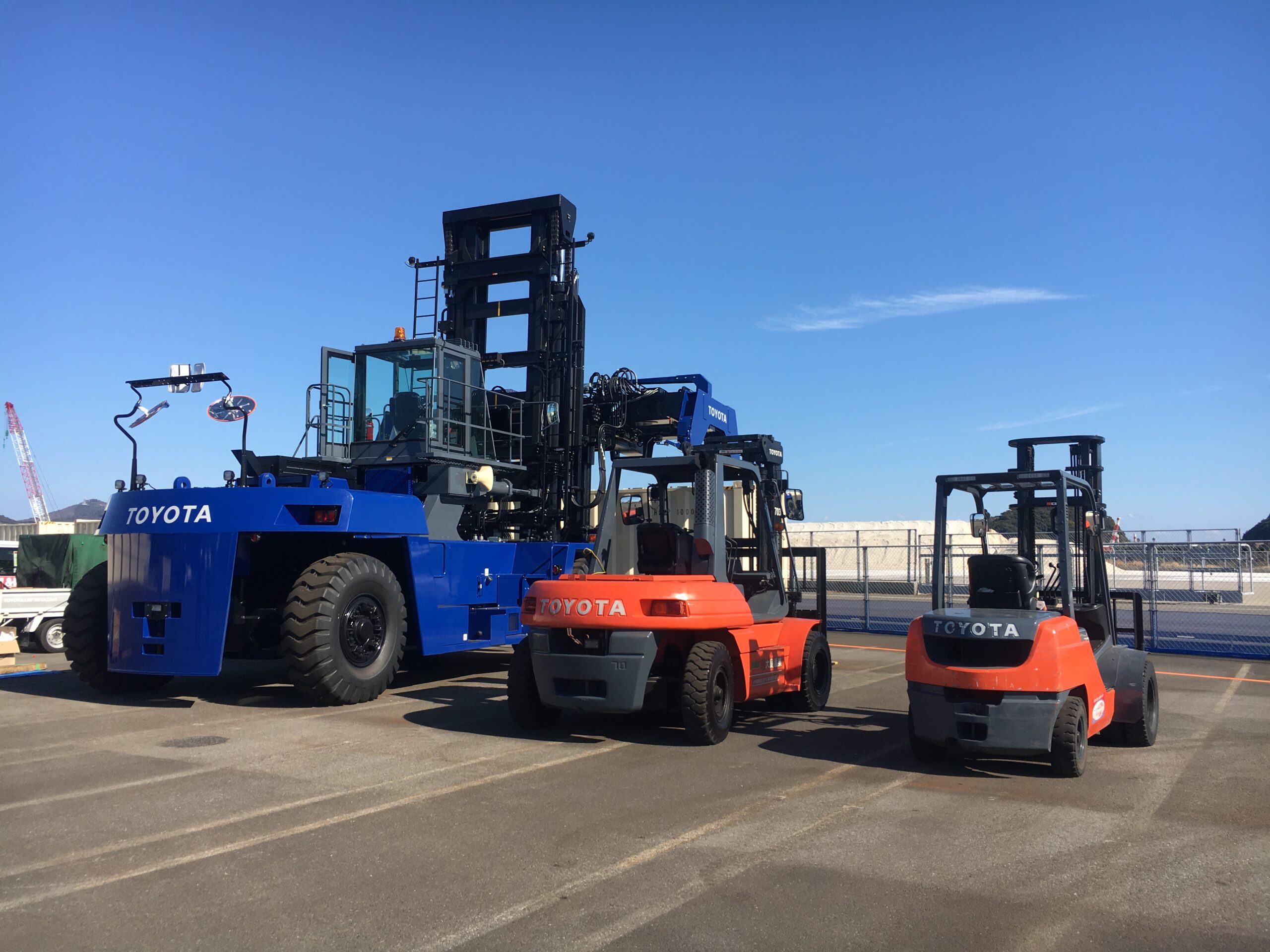 37tクラスのフォークリフトは完成状態での輸送が困難なため、愛知の工場で完成検査後、マスト・キャビン・タイヤ・ウエイト・アタッチメント部を分解し、船とトラックで数日かけて搬送。到着後は大型クレーンを用いて2日間かけて現地で組み立てを行いました。