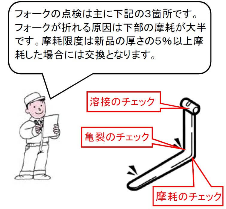 フォークの強度は基準中心に最大荷重を載せた時の安全率が3倍以上であることが「フォークリフト構造規格」によって定められています。また、左右のフォークを合わせた時の段差は15㎜以内、広がりは10㎜以内の基準値もあります。フォークは使用により摩耗や亀裂が発生する可能性があり年次検査での点検が義務付けられています。